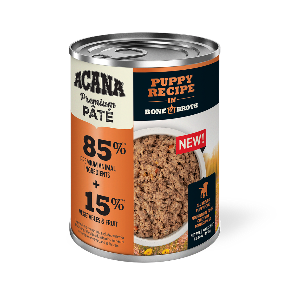 Los alimentos para mascotas ACANA siempre superan las expectativas en lo que respecta a la elaboración de nuestras nutritivas recetas. Cada lata de paté premium ACANA se elabora cuidadosamente de principio a fin. Nuestra receta de paté para cachorros en caldo de huesos es un paté especialmente formulado para nutrir el crecimiento y el desarrollo de su cachorro. Con un 85 %* de ingredientes animales de primera calidad como pollo, pavo y arenque, está equilibrado con un 15 %* † de frutas y verduras visibles. Nuestra receta también está en una sabrosa base de caldo de huesos para darle sabor y nutrición. Añádalo a las croquetas ACANA favoritas de su cachorro para brindarle humedad y nutrición, o dáselo solo para disfrutar de un delicioso premio a la hora de comer.