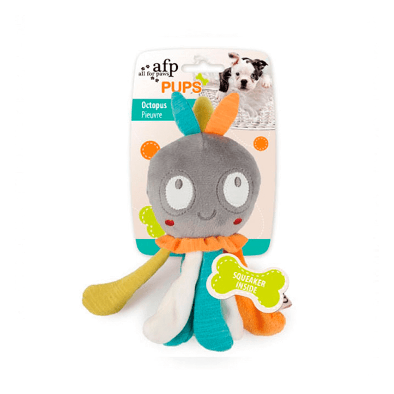 AFP Pups pulpo es un juguete para cachorros confeccionado con tela suave, relleno blando y un sonido interior de cascabel. AFP Pups pulpo ¡Será el mejor compañero de juegos de tu nuevo cachorro!