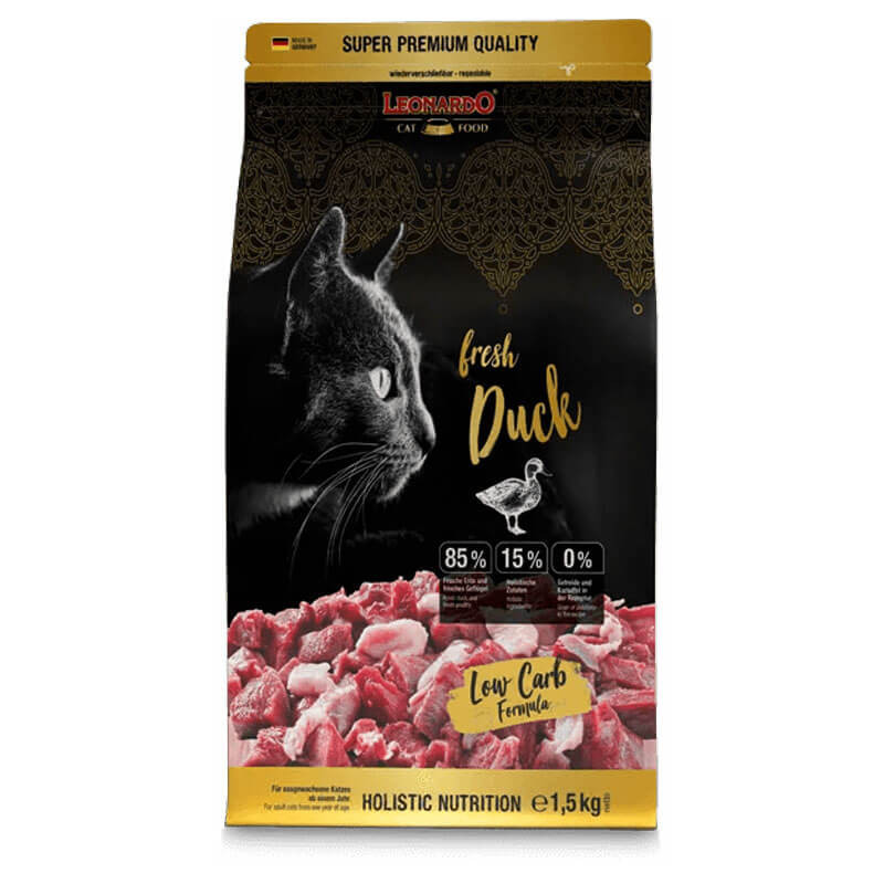 Leonardo Fresh Meat Pato Las recetas de Leonardo Fresh Meat no solo llevan gran cantidad de carne, sino también ingredientes vegetales selectos, por lo que se toleran extremadamente bien. Los valiosos nutrientes de las verduras, hierbas y la mezcla de frutos rojos complementan la carne fresca de manera conveniente y corresponden al patrón nutricional natural de nuestros gatos. Los ingredientes especiales como los arándanos, las algas chlorella y las semillas de chía también tienen un efecto positivo en el bienestar del gato. Son parte del concepto de nutrición holístico (integral) en el que se basa cada receta de LEONARDO® fresh Meat. La carne es un bien preciado;– de ahí el afán por prepararla lo mejor posible. Para LEONARDO® fresh Meat se procesa la carne fresca y, en la medida de lo posible, se prescinden de la harina de carne presecada. Así se consigue una preparación que antes se consideraba imposible. Con la especialmente cuidadosa tecnología de Fresh Meat, la carne fresca se procesa directamente como una croqueta. Permite omitir las fases previas de secado, y los ingredientes utilizados conservan su frescura hasta justo antes del procesamiento. Es el único modo de garantizar que la croqueta adquiera todo el sabor de la carne. Beneficios Provital Refuerza las defensas con beta-glucanos procedentes de levadura de cerveza. Control de PH Optimiza el valor del pH de la orina STAY-CLEAN™ Reducción de la placa COMPOSICIÓN carne de pato fresco (43 %); carne de ave fresca (42 %); harina de guisantes; amaranto; zooplancton marino molido (krill, 1,7 %); huevo secado; harina de pescado de agua salada, secado, hidrolizado; hígado de ave hidrolizada; semillas de chía; levadura de cerveza secada (0,4 %, fuente de oligosacáridos beta-glucano y manano); vainas de algarroba, secas; orujo de manzana, seco; verduras, secado (zanahorias, chirivías, remolacha, puerro); algas secas (0,18 %, Chlorella vulgaris); fosfato dicálcico; cloruro de potasio; bayas silvestres, secado (total: 0,07 %; bayas de serbal, escaramujos, mirtilo, bayas de saúco, grosellas); arándanos (0,07 %); hierbas, secadas (hojas de ortiga, raíz de genciana, centaura menor, manzanilla, hinojo, alcaravea, muérdago, aquilea, hojas de zarzamora); extracto de aceituna (Olea europaea) ANÁLISIS DE LOS COMPONENTES proteínas 40 %; contenido de grasa 22 %; cenizas brutas 7,0 %; fibras brutas 2,5 %; humedad 10 %; calcio 1,0 %; fósforo 0,9 %; sodio 0,4 % ADITIVOS POR KG Aditivos nutricionales: vitamina A 15.000 UI; vitamina D3 1.500 UI; vitamina E 150 mg; vitamina C (como monofosfato de ascorbilo, sal sódica) 245 mg; taurina 1.400 mg; cobre (como sulfato de cobre II, pentahidrato) 15 mg; hierro (como sulfato de hierro II, monohidrato) 200 mg; manganeso (como óxido de manganeso II) 40 mg; zinc (como óxido de zinc) 150 mg; yodo (como yodato cálcico, sin agua) 2,5 mg; selenio (como selenito de sodio) 0,15 mg Aditivos tecnológicos: lecitina 2.000 mg; extractos de tocoferol de aceites vegetales (= vitamina E natural) 80 mg Cantidad de alimentación recomendada por animal en g/día 3 kg castrado/indoor 25-40g / activo 50g 4 kg castrado/indoor 30-45g / activo 60g 5 kg castrado/indoor 35-55g / activo 70g 6 kg castrado/indoor 40-60g / activo 80g 7 kg castrado/indoor 45-65g / activo 90g Presentación: Bolsa de 1,5 kg