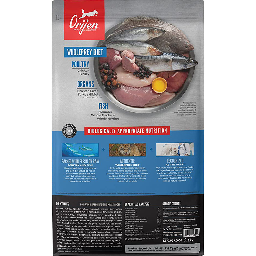 Los perros son ancestralmente carnívoros, así que necesitan una dieta Biologically Appropriate™ (Biológicamente Apropiada) rica y variada en ingredientes enteros de origen animal. La dieta ORIJEN™ Original ofrece un 85%1 de ingredientes de origen animal de calidad como pollo y pavo frescos o crudos, así como pescado salvaje o de piscicultura sostenible. Rico en ingredientes de origen animal de presa entera como órganos y huesos, ORIJEN™ Original está elaborado con las partes suculentas y nutritivas de la presa, para proporcionar la nutrición que los perros necesitan. El resultado es una dieta para tu perro que no tiene comparación.